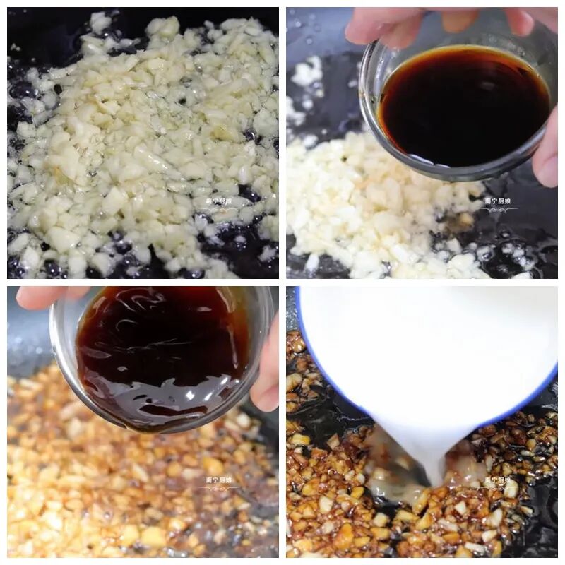 第三步,将锅中的水倒掉,开中火烧干锅面,再倒入适量的花生油和蒜米,反复翻炒,直到把蒜米爆香炒熟。接着倒入刚才调制好的酱料和水淀粉,不断用铁铲搅拌,直到把酱汁烧得浓稠有色泽。最后,将香喷喷的酱汁浇在生菜上,这一道健康营养又低脂美味的蚝油生菜就做好啦!