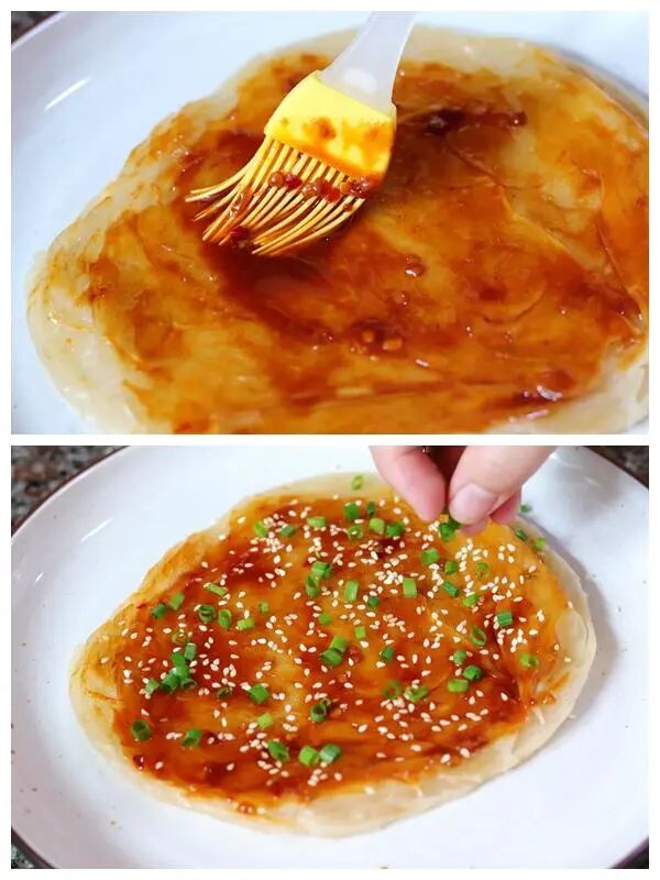 3、手抓饼煎好后,放到大盘子中,用刷子蘸上之前做好的酱料,把手抓饼的两面都刷上酱料,再撒上些许熟白芝麻,撒上葱花碎点缀增香。