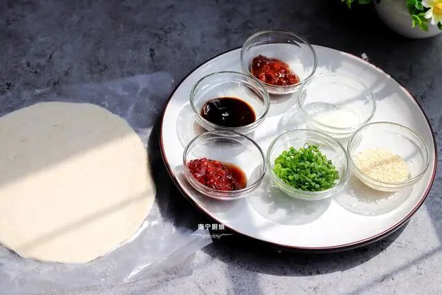 需要用到的材料:原味手抓饼、郫县豆瓣酱、黄豆酱、甜面酱、糖、食用油、葱、熟白芝麻。