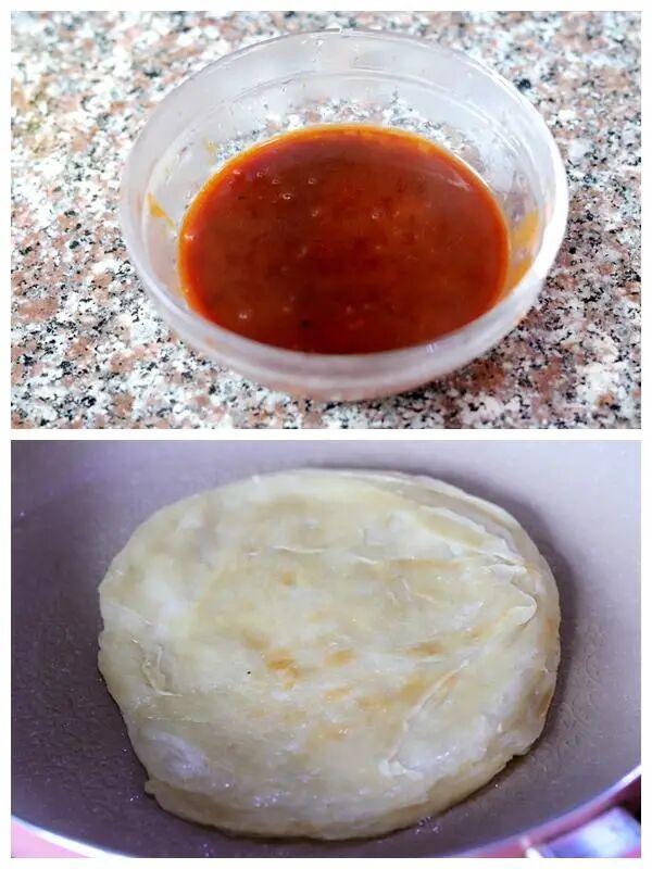 2、酱料调制好后,倒入碗中待用,然后取一个平底不粘锅,滴入少量食用油,小火烧热,把手抓饼放入锅中,开中火慢慢煎制即可,不要心急哦,要记得适时的给饼翻面,等到手抓饼的两面都被煎成金黄的颜色时,才可以出锅哦。