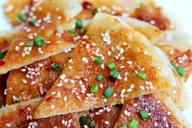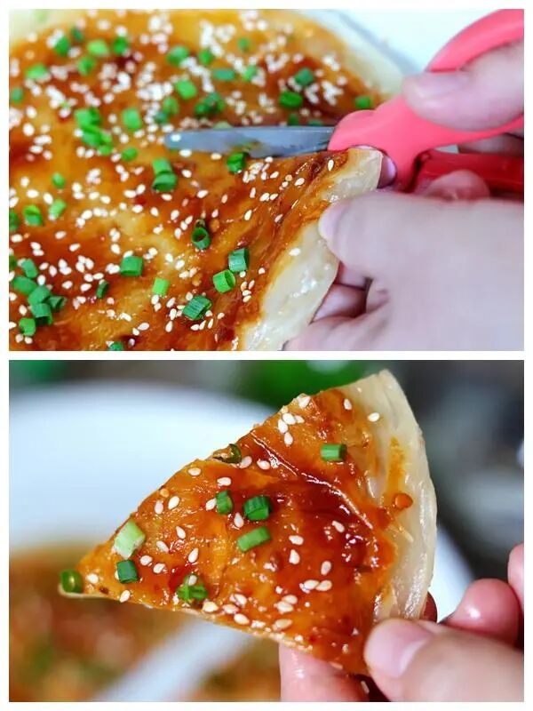 4、我们用剪刀把手抓饼剪成三角形或者自己喜欢的形状,装盘即可上桌开吃!