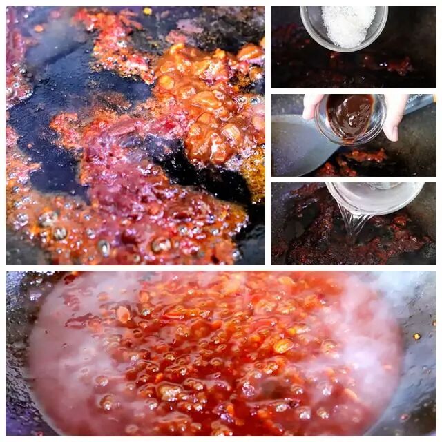 1、起锅,在锅中滴入少量油,开小火烧热油,把郫县豆瓣酱倒入锅中滑散,然后依次倒入些许白糖、黄豆酱、甜面酱翻炒均匀,然后再倒入半碗清水,把锅中的酱汁给烧至浓稠。(食材中的酱料不是固定备品,大家可以根据自己的口味和喜好来调制酱料。我喜欢甜味的所以一定要加一些甜面酱。把食材中准备的酱料拌匀以后,大家也可以根据自身食用习惯决定是蘸着吃还是刷好了酱料再吃。)