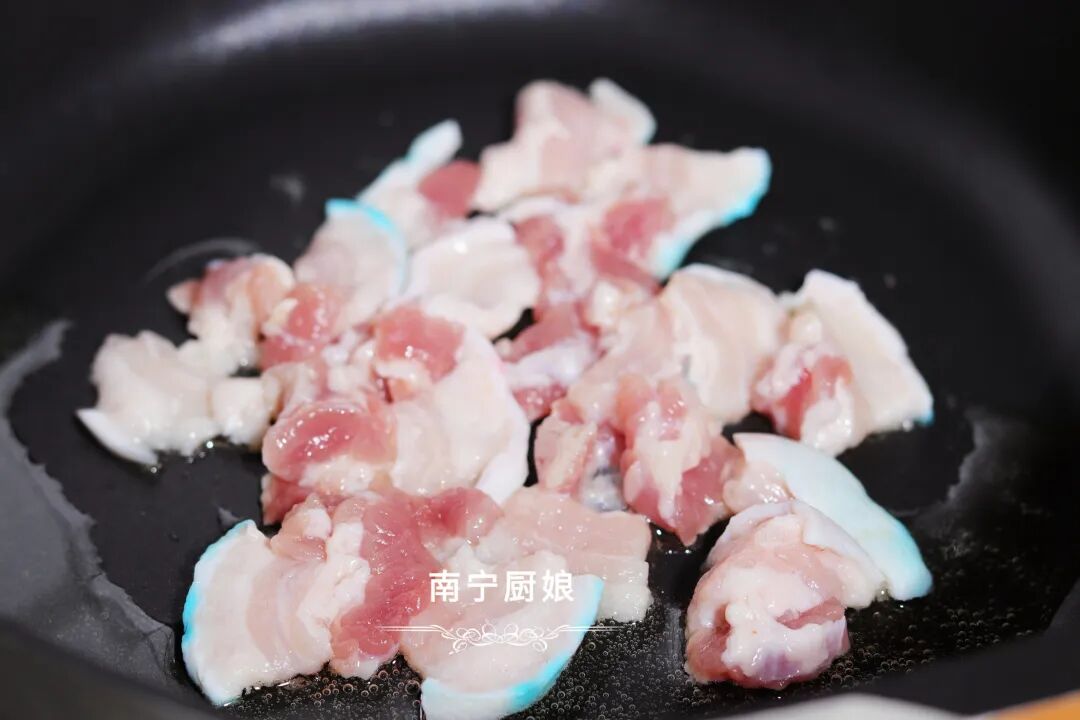 2、起锅,冷油下锅,调中火烧热锅中的油,然后倒入五花肉片煸炒出油脂和香味。
