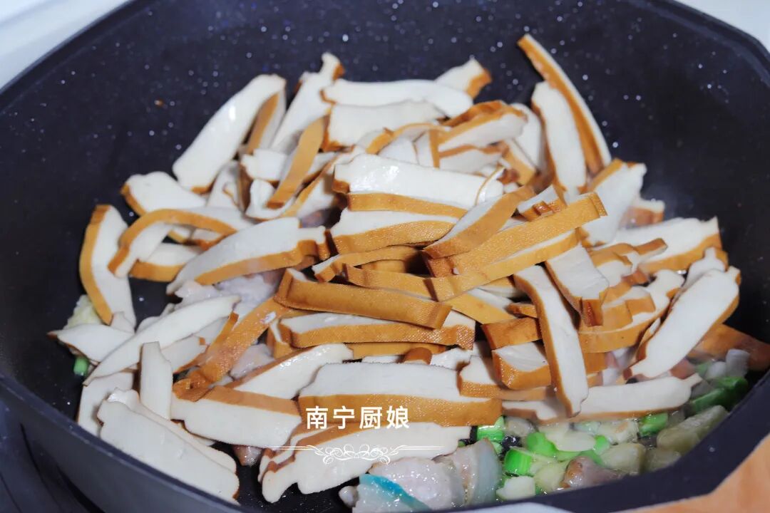 5、倒入之前调制好的酱汁,大火烧煮1分钟,让香干和肉片吸收料汁入味。