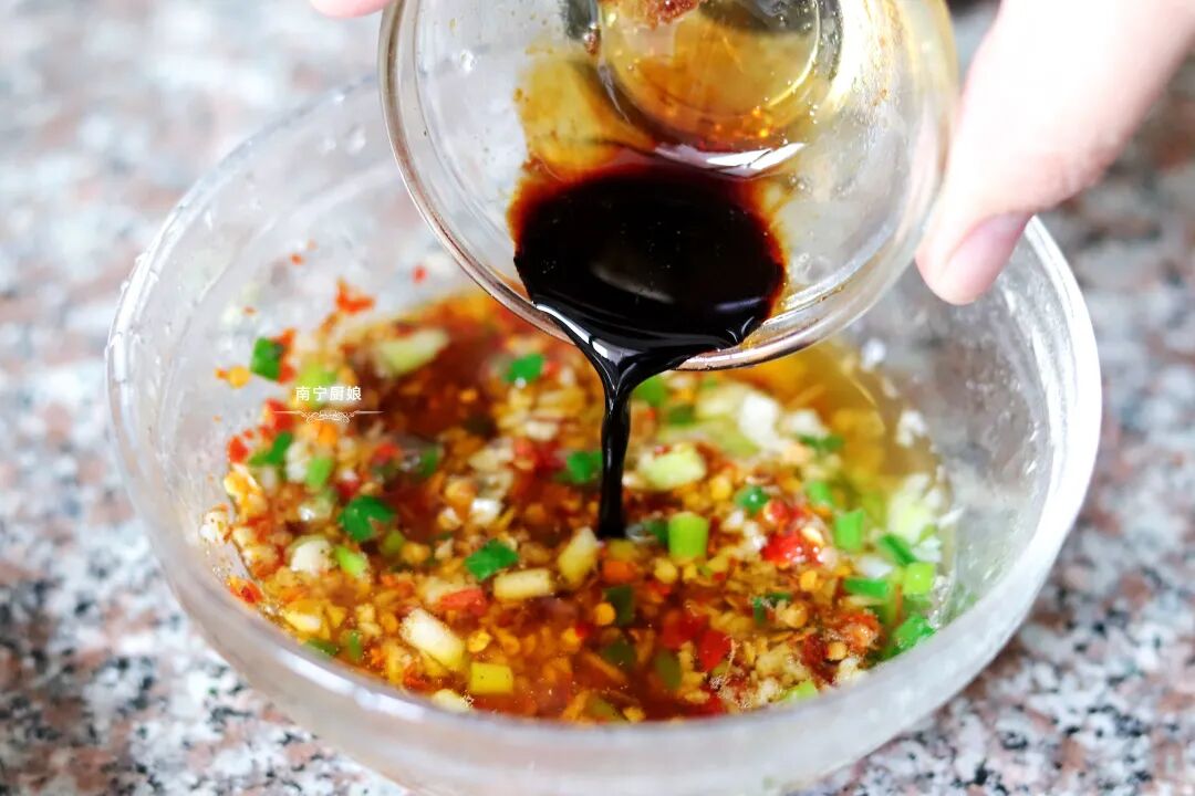 2、把一大勺热油泼入碗中,接着淋上生抽、老抽、蚝油糖和盐,然后用筷子均匀搅拌,混匀备用。