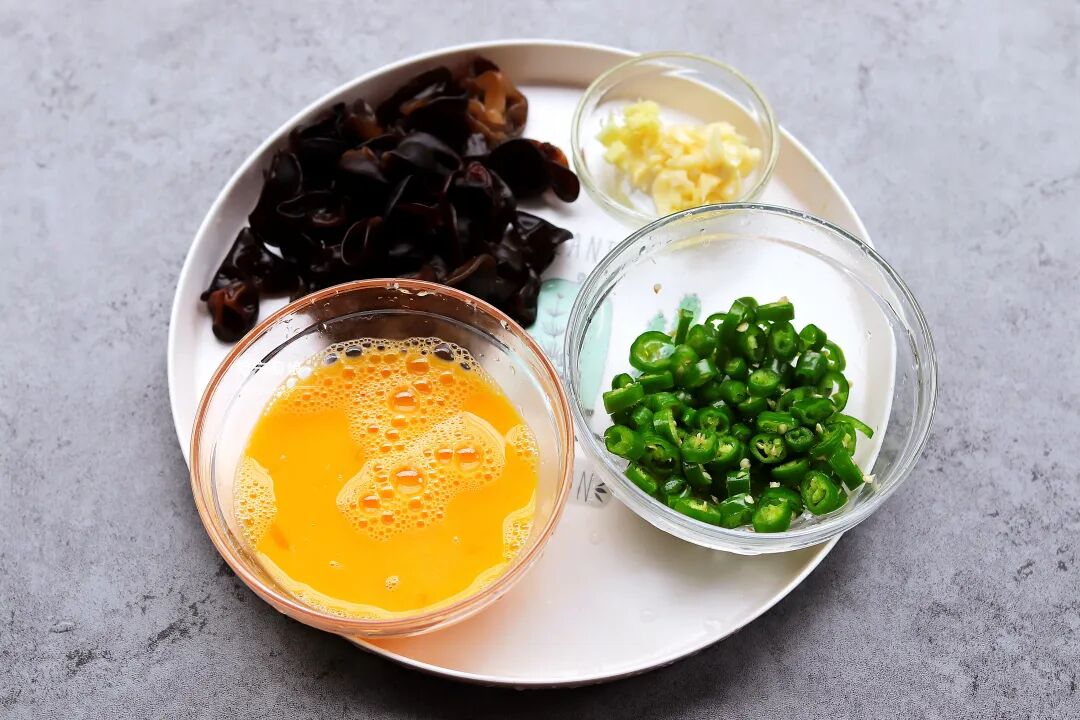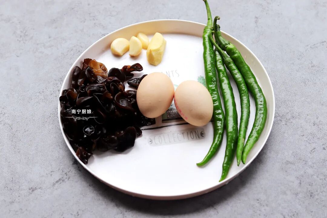 食材准备:鲜木耳100g,鸡蛋2个,线椒4根,姜1块,蒜3瓣,生抽1勺,适量的盐,食用油。