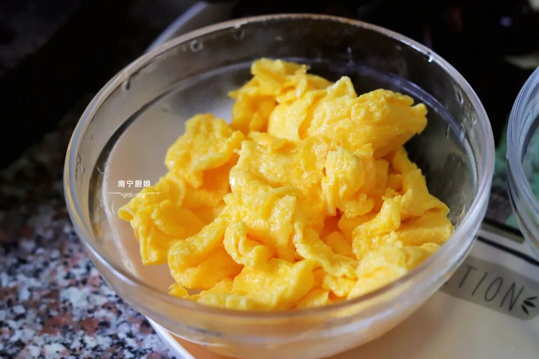 第二步:锅里放油,油热后把蛋液倒进去等鸡蛋液稍微凝固再慢慢推开,用锅铲弄成鸡蛋碎后盛出。