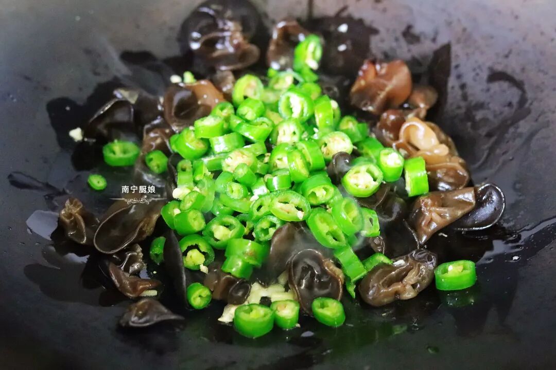 第三步:再次起锅热油,把姜末和蒜末放进去煸香,接着把木耳和小青椒放进锅里翻炒,炒的时候再加一点盐。