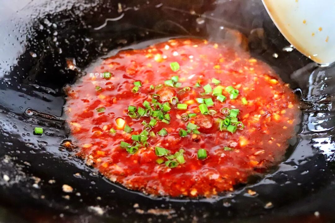 第五步:接下来开始炒制酱汁。起锅热油,把蒜末倒进锅里煸香,接着加入3勺番茄酱,2勺生抽,1茶匙盐,2茶匙糖和葱花进锅里一起翻炒,炒到酱汁变得浓稠溢香。