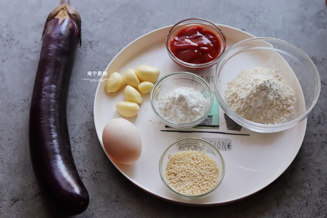 准备食材:长茄子1根,淀粉50g,中筋面粉100g,鸡蛋1个,蒜末20g,番茄酱3勺,生抽2勺,盐1茶匙,白糖2茶匙,葱花10g,熟白芝麻15g