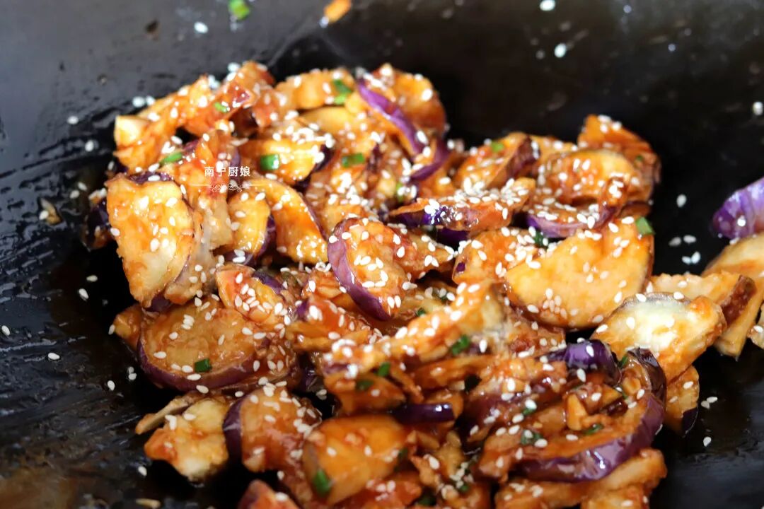 第六步:加入之前炸得香酥的茄子,让茄子和酱汁充分融合,最后再撒上一小把白芝麻,这样,我们的风味茄子就可以出锅装碟了。