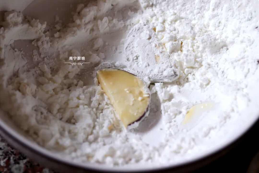 第三步:在另一个碗里倒入50g中筋面粉,把沾匀面糊的茄子倒进去再裹上一层面粉,这样炸出来的茄子会变得更酥脆。