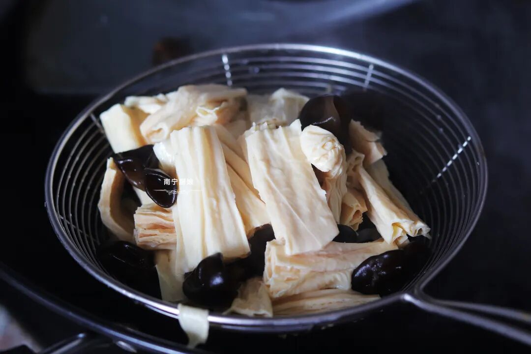 第三步:锅内注入半锅清水,开火煮沸后放入木耳滚2-3分钟,再放入腐竹滚1-2分钟,捞出来沥干。