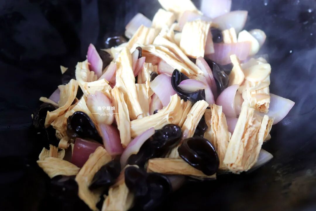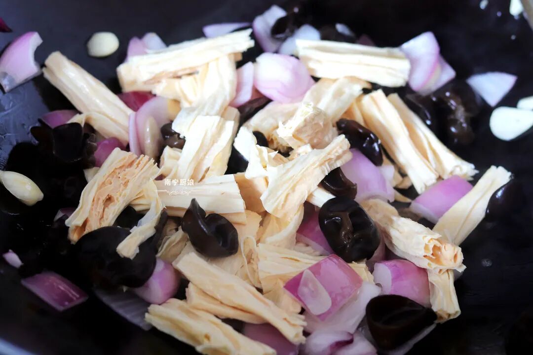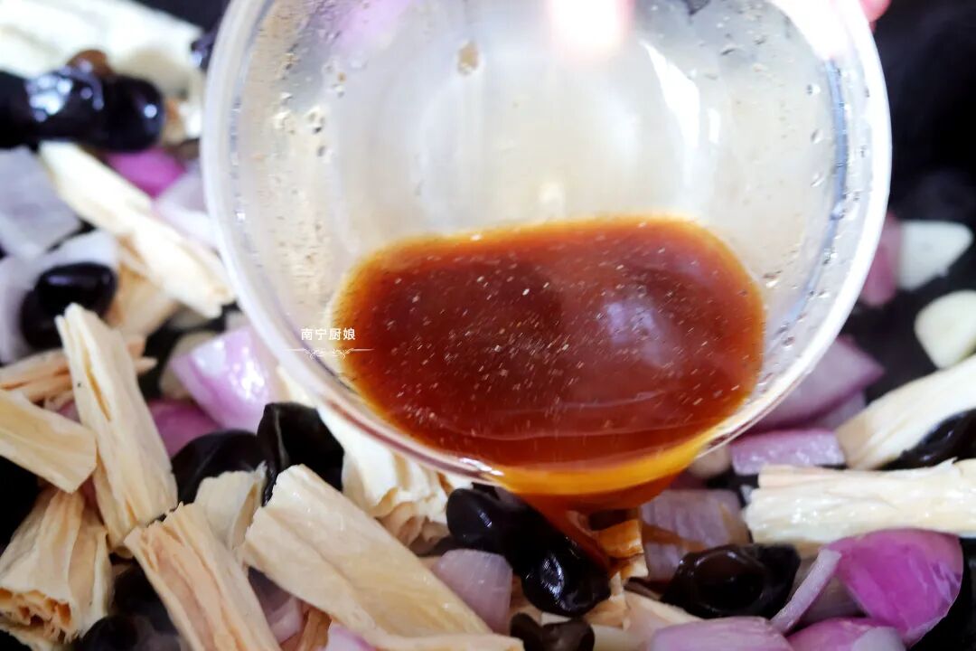 第五步:接着开大火,把木耳和腐竹倒进锅里翻炒半分钟左右后,均匀淋入事先备好的调料,再次翻炒,等汤汁变得浓稠透明的时候就可以出锅了。