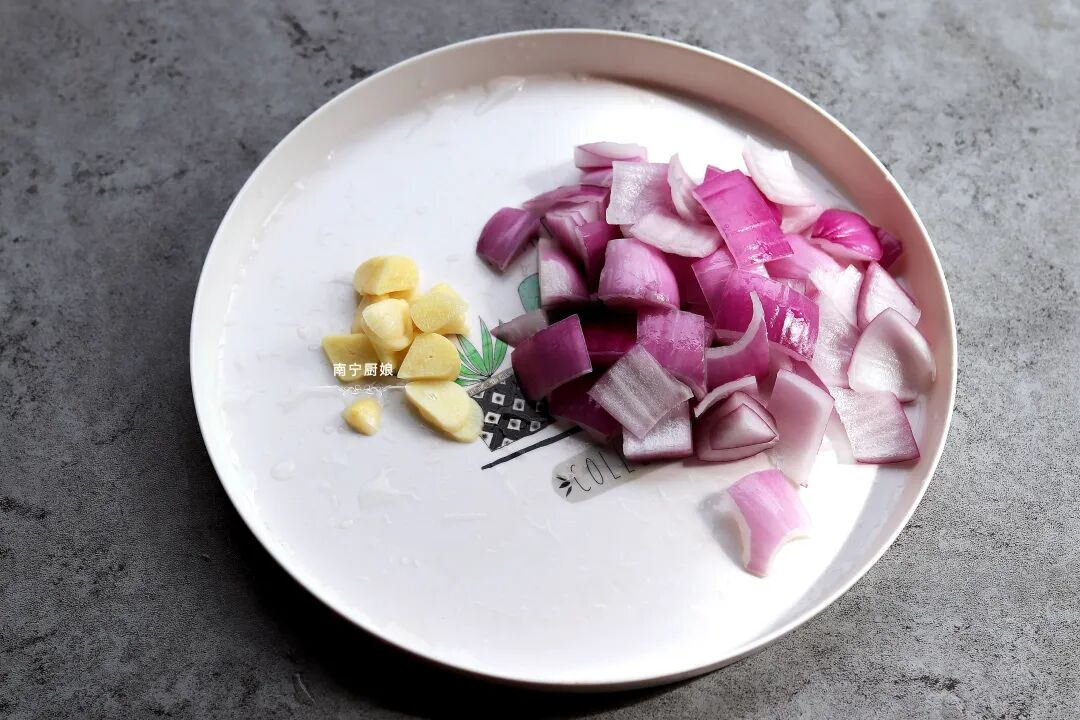 第二步:洋葱用半个的量就可以了,把洋葱切成片状,蒜切成片,葱切碎。