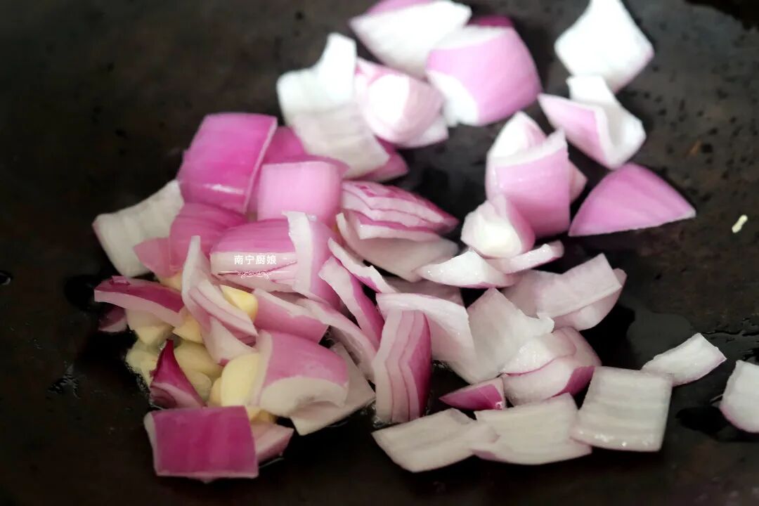 第四步:在锅里面刷上一层油,开中火等油五成热,放入蒜片进去煸香,炒香后把洋葱片放进锅里炒,直到洋葱片变得透明入味。