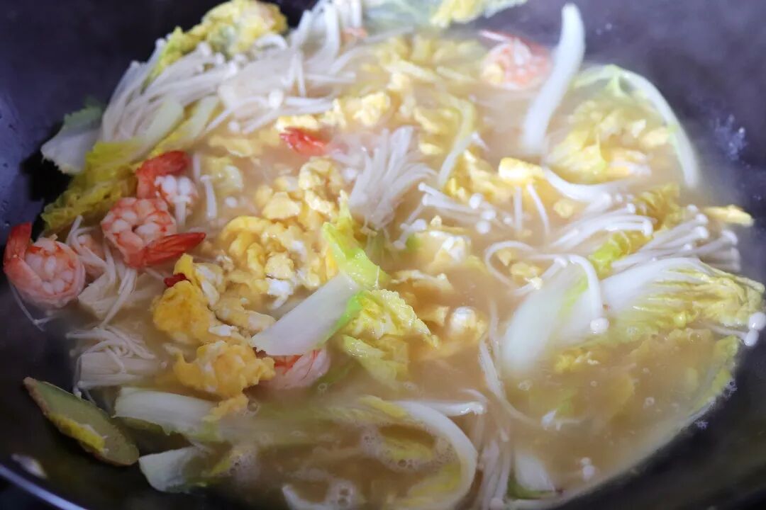 满满的一大锅鲜蔬汤带着鲜虾仁的香味,颜色也在嫩黄的娃娃菜的点缀下显得更加好看。因为是用新鲜虾头爆香出油煮的汤,所以喝起来更加的鲜香。