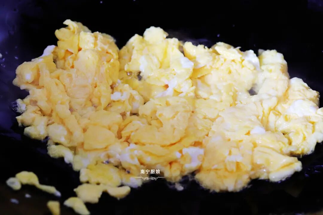 第二步:在干净的炒锅里加入适量的花生油烧热,倒入鸡蛋液把鸡蛋煎成嫩黄就可以盛出来备用了。