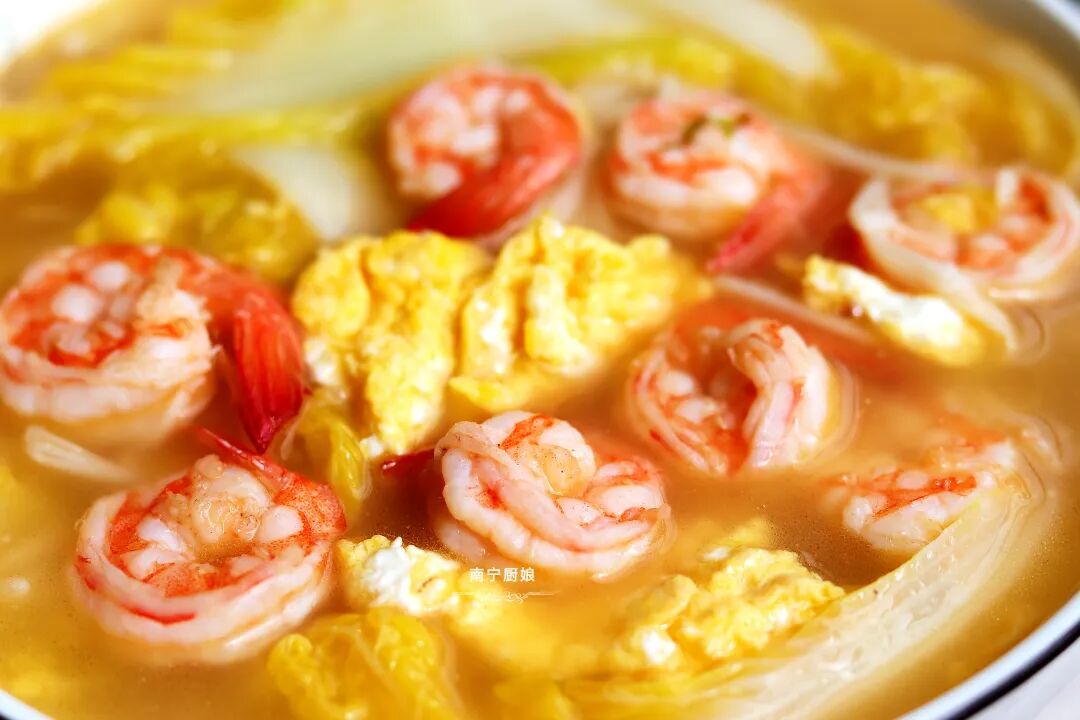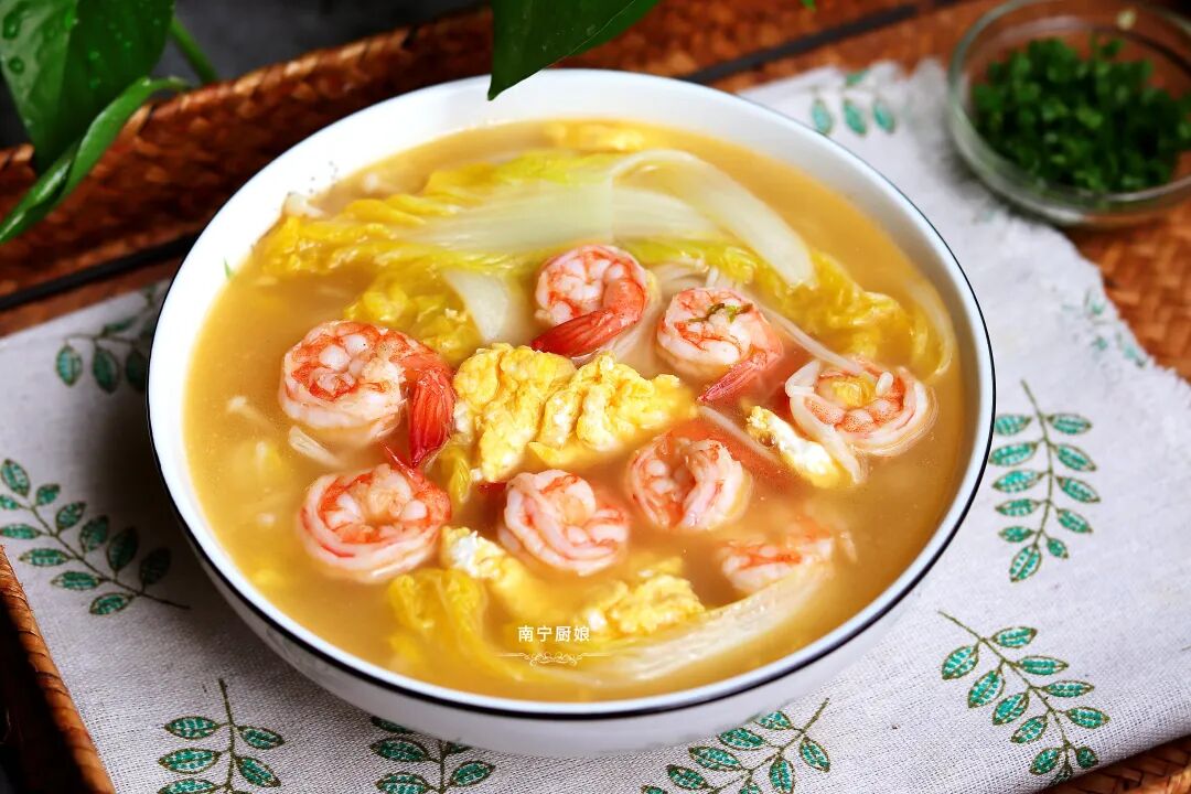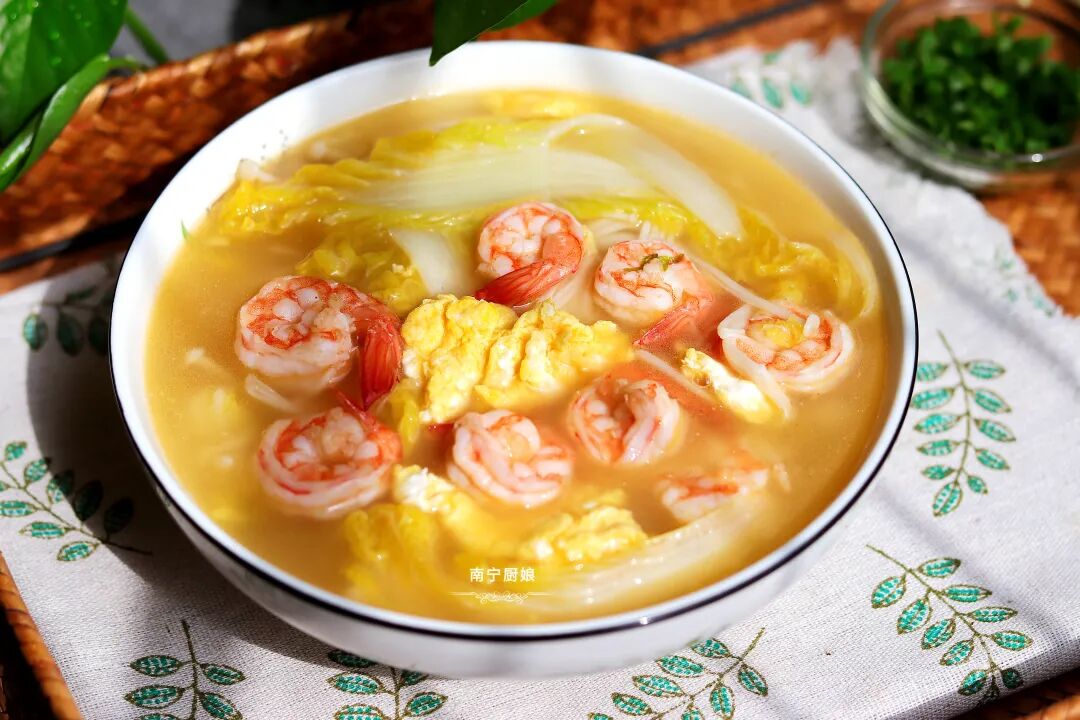 这道汤里面的虾仁和鸡蛋都是补充蛋白质的食物,用来煮汤再合适不过。而白菜又是可以补充钙元素的,白菜的钙含量可以和牛奶抗衡。有句俗话说“百菜不如白菜”,白菜的口感真的是脆甜可口,水分含量又高,很多女孩子都非常喜欢吃娃娃菜。