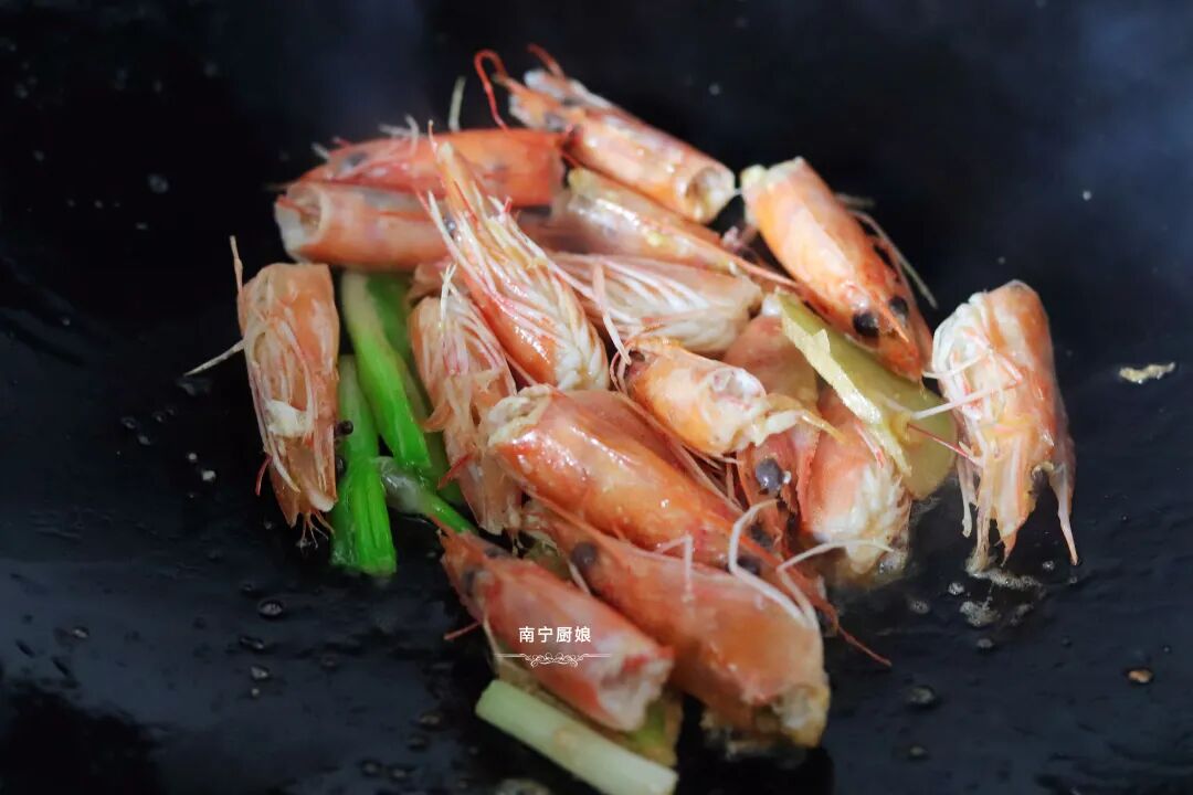 第三步:重新放少量花生油进炒锅,等油烧热后加入葱白、姜片,然后把准备好的虾头放进烧热的锅中,调整火候为小火,虾头煎出油后捞起来放一旁。