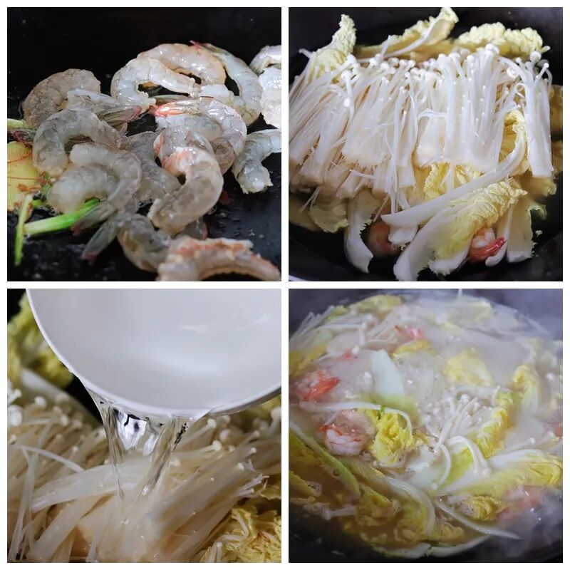 第四步:把处理好的虾仁肉放进锅里翻炒出香味,等鲜虾仁收缩起来且变色后,把摘好的白菜、金针菇放下去翻炒一下,倒入600毫升的水煮开。