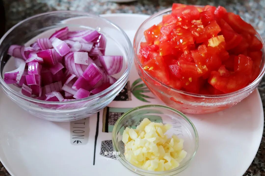 第二步:在蒸蛋的过程,将番茄洗干净后切小块,把洋葱切丝切末,蒜瓣剁末,葱切成葱花。