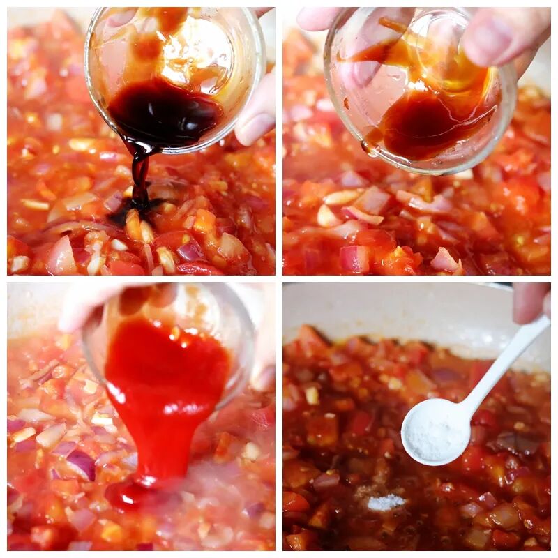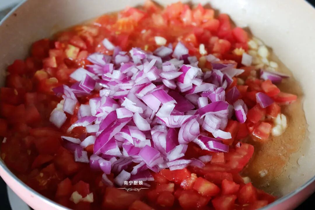 第四步:就着煎蛋用的油,如果油不够继续加入适量的油,接着放入提前剁好的蒜末进锅里煸香。等蒜的香气出来了,加入番茄和洋葱进锅里翻炒,翻炒均匀后放入1勺蚝油,1勺生抽,2勺番茄酱和适量的盐进锅里面搅拌。