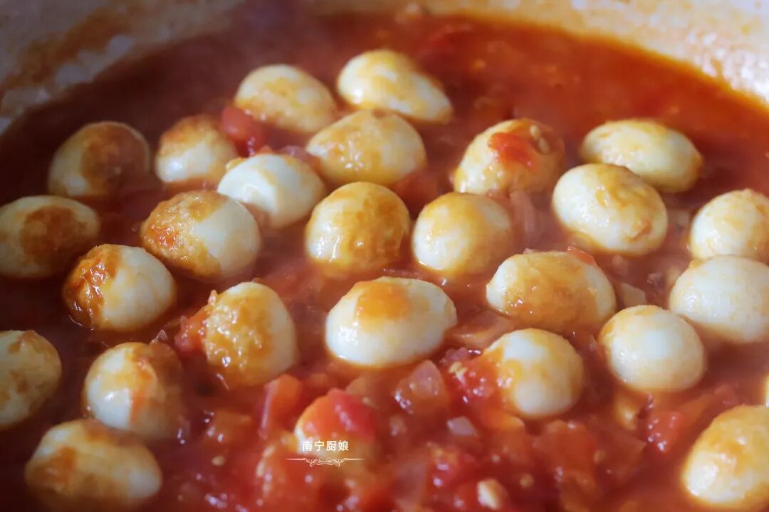 第五步:这时候番茄已经变得烂烂的很入味了,接着我们加入之前煎好的鹌鹑蛋进锅里面和番茄汁一起简单的用锅铲简单的搅拌翻炒一会儿,就盖上锅盖,开小火闷10分钟左右后,让鹌鹑蛋和番茄汁的味道融合在一起,便掀开盖子,撒上葱花搅拌一下,美味的茄汁虎皮鹌鹑蛋就可以出锅盛盘了。