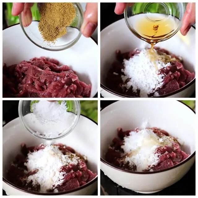 2、把切好的牛肉在下锅之前,我们再放入碗中,倒入淀粉、生抽、食用油来腌制下,让牛肉更鲜嫩。
