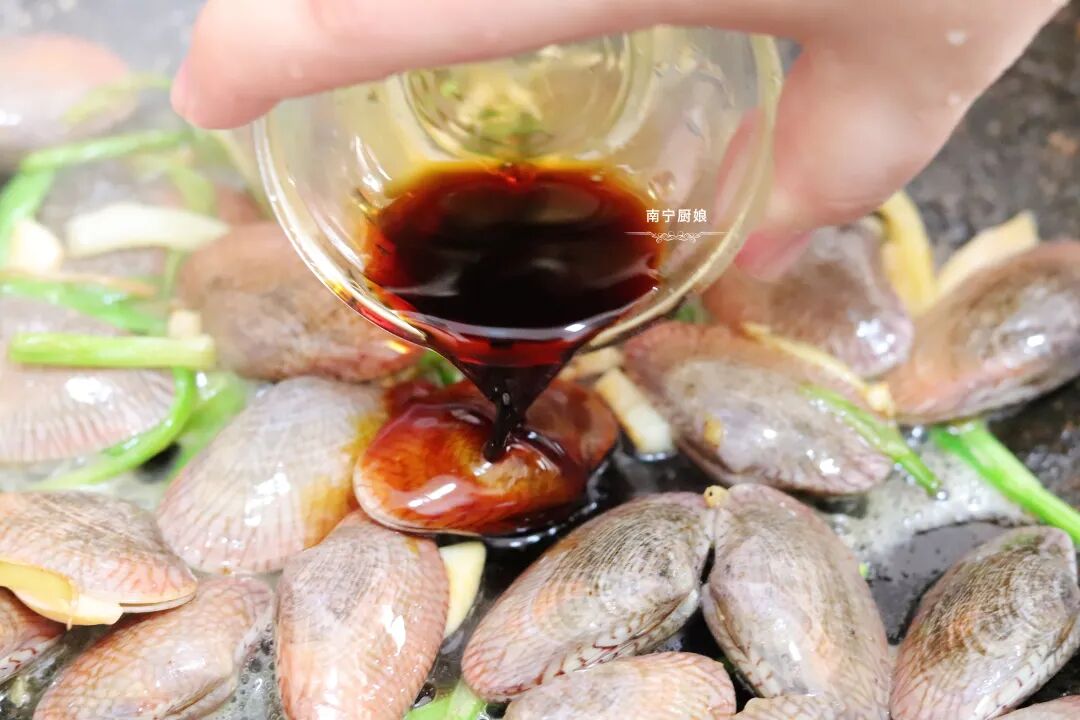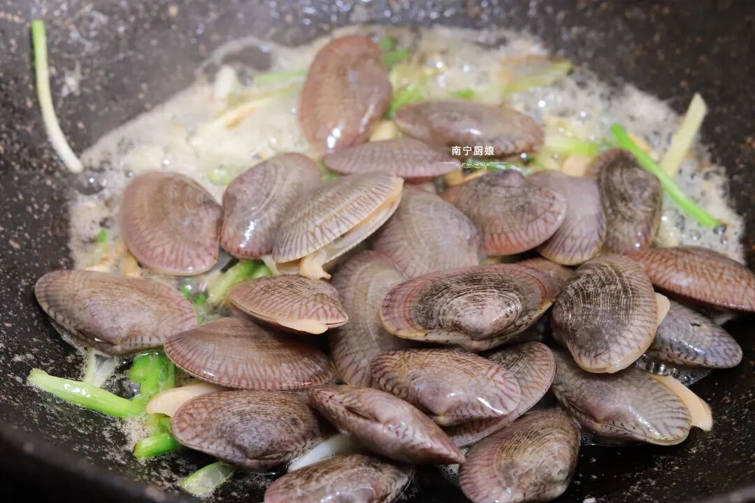 第四步:之后把晾干水分的蛤蜊倒进锅里开大火翻炒,等到蛤蜊全部张开后,放入一勺生抽,半勺蚝油,继续翻炒均匀,翻炒到蛤蜊已经上色入味后开中火,在装盘前加入香葱再翻炒一分钟就可以出锅了。
