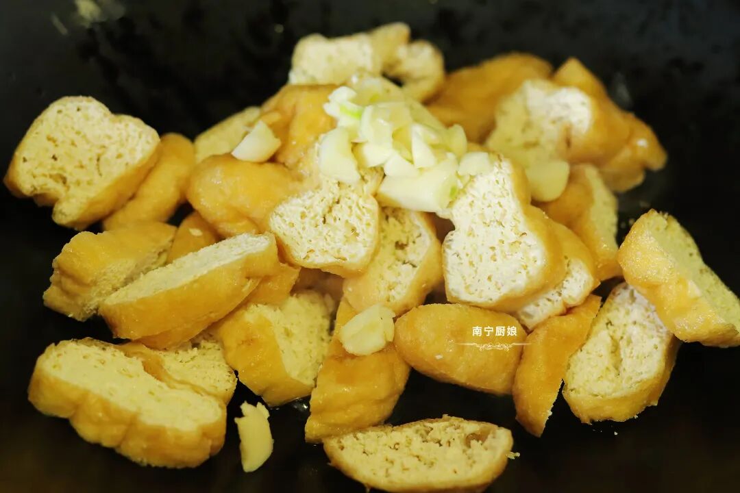 2、将锅洗干净后开大火将锅烧至没有残留的水将冷油和豆腐泡同时放入锅中,当油开始滋滋响时将准备好的蒜末倒入锅中爆香。