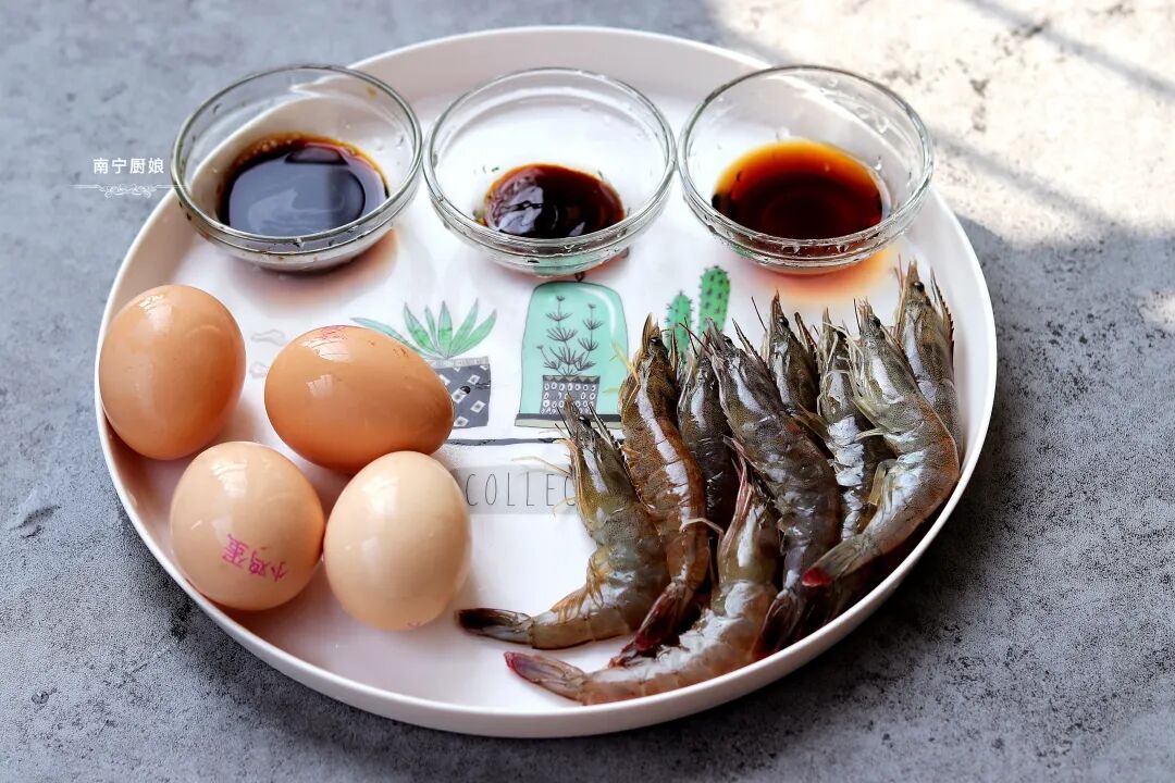 准备的食材和配料:鸡蛋4颗、鲜虾200克、生抽10克、蚝油10克、香醋5克、糖5克、玉米淀粉3克、花生油20克。