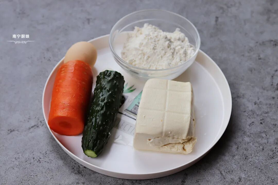 1块北豆腐、小半根胡萝卜、小半根黄瓜、1个鸡蛋、30克中筋面粉。