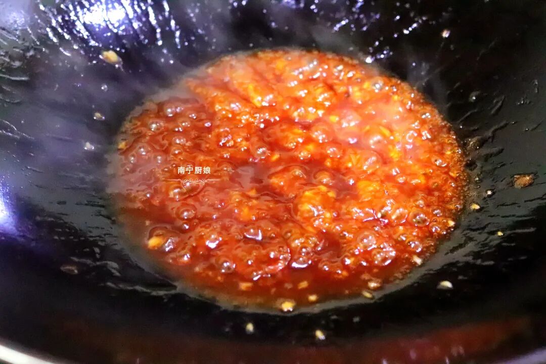 第三步:在锅中放入适量花生油,把油烧热之后放入蒜末炒香,之后加入蚝油、生抽、盐巴、蜂蜜和番茄酱搅拌均匀,加入适量清水后将酱汁熬制成浓稠状态。
