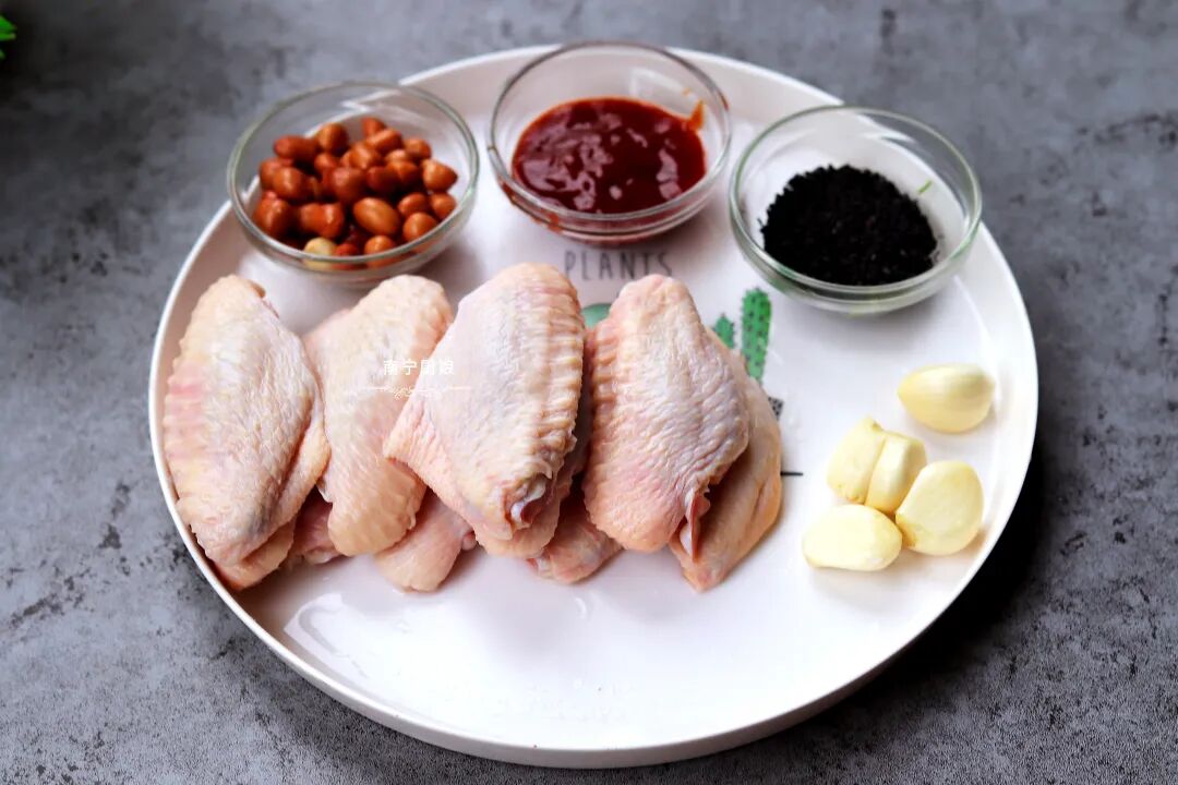鸡翅中9个、花生碎30克、普通面粉(中筋)50克、蚝油、蜂蜜、生抽各15克、番茄酱20克、食用油15克、蒜末各10克、黑芝麻5克。