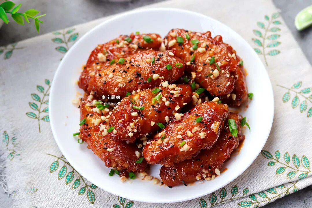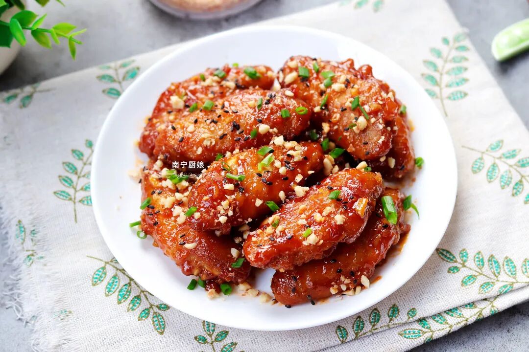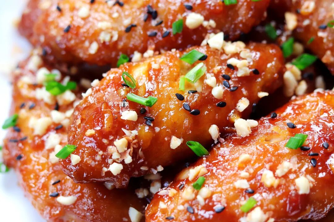 新鲜出锅的蜜汁鸡翅散发着诱人的香味,浓稠的酱汁包裹着焦黄的鸡翅,在黑芝麻和花生碎的点缀下让人看起来更加地有食欲。