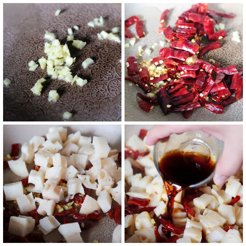 2、起锅热油,把干红辣椒、姜末放进去小火翻炒出香味,接着把藕丁放下去来回翻炒五分钟,接着加入10克生抽、15克香醋、2克糖和1克盐巴继续翻炒均匀。