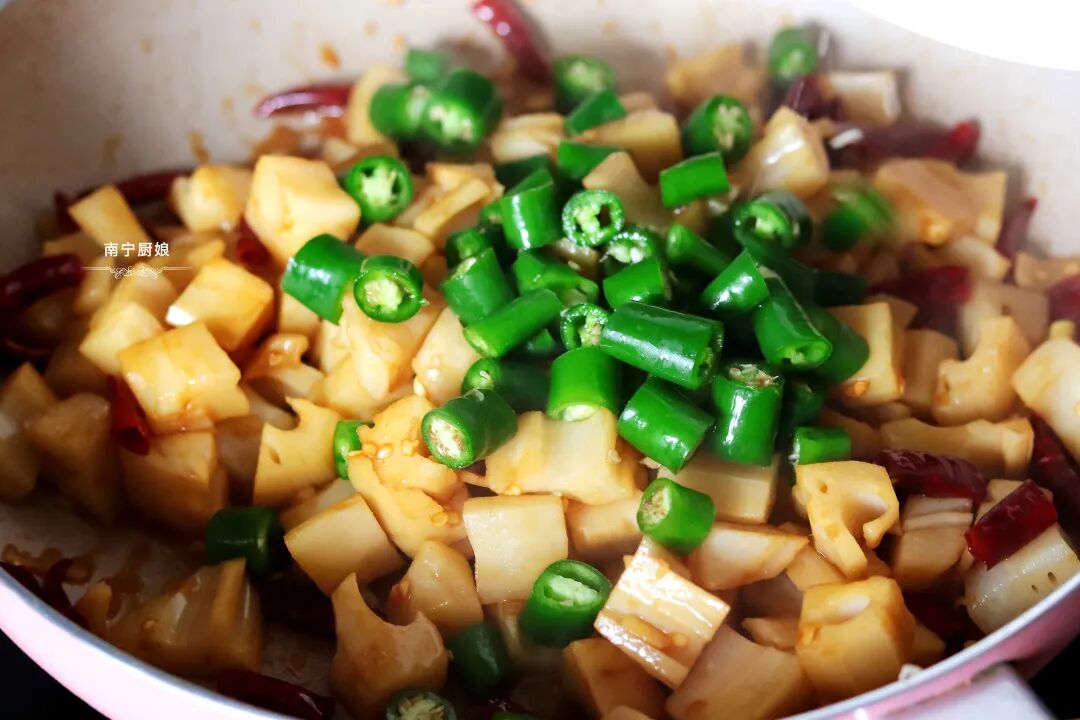 炒出来的酸辣藕丁在青红辣椒的点缀下愈加的好看,切成藕丁形状的脆藕小巧玲珑,吃起来酸辣脆口,开胃又解腻。家人朋友一口一颗还嫌不过瘾,要用勺子一口一勺才过瘾。