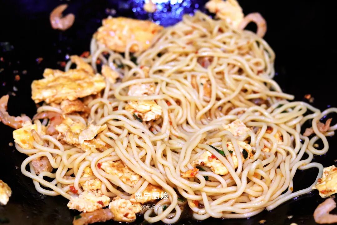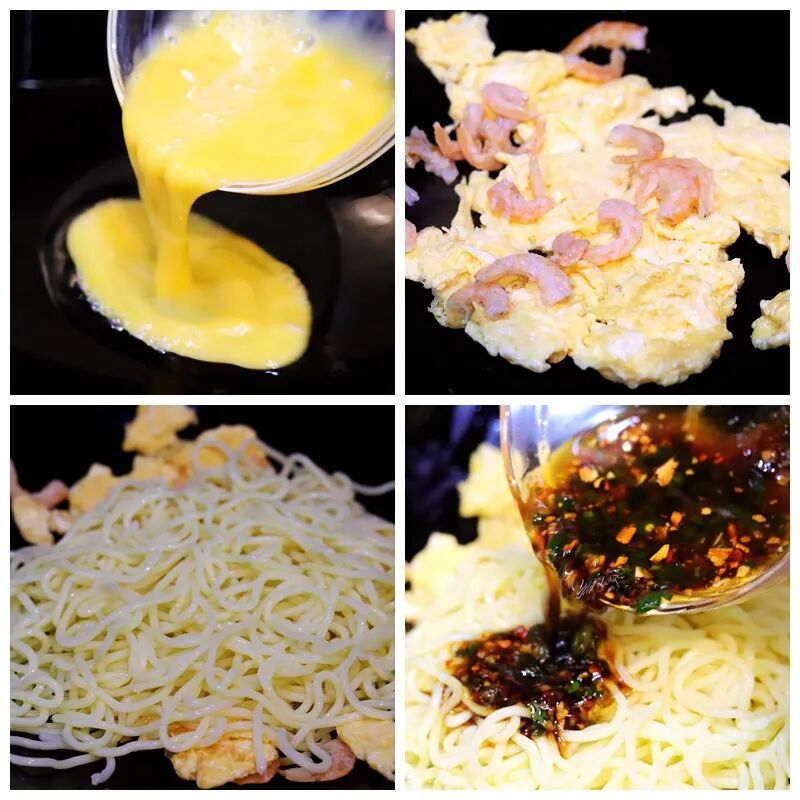 步骤四:准备一个干净的锅,开中火将锅烧热之后倒入适量的食用油,油烧至八成热时,可将鸡蛋倒入锅中,当鸡蛋液成固状时就可以用锅铲来翻动了,然后加入剥好壳的虾仁,当虾仁表面变成橙红色时,可将准备好的面条倒入入锅中翻炒。