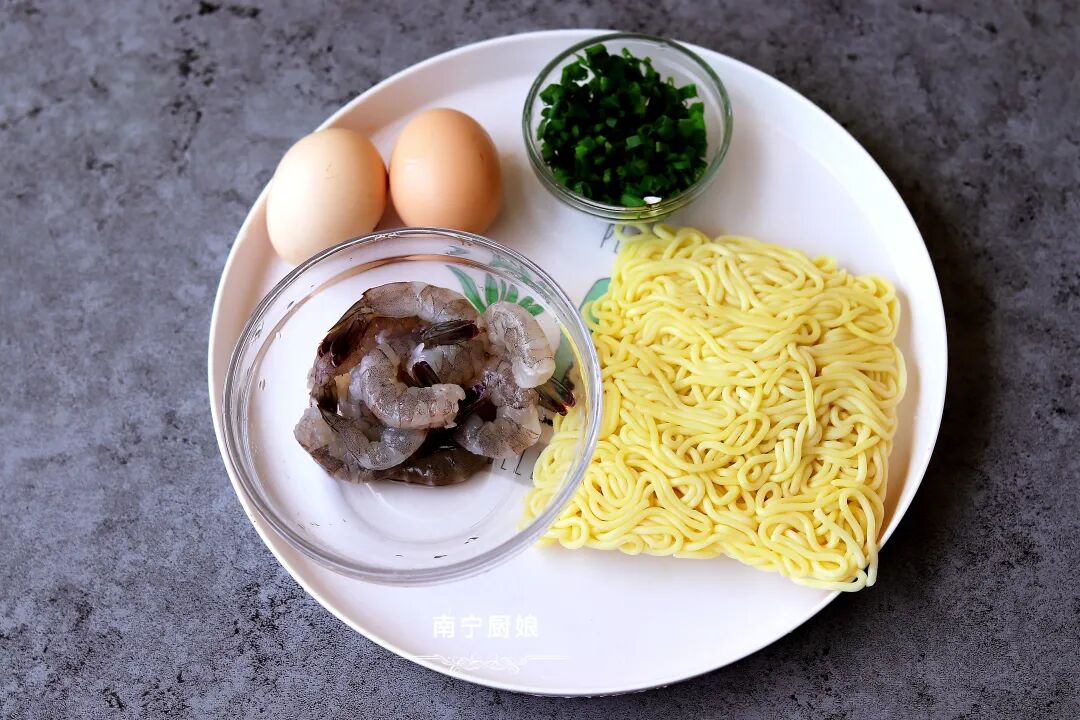 【食材】150克面条(建议采用现做手工面条吃起来比较劲道,我们这里面条店还没开门,只能去超市买冷冻的面条了)、120克虾仁、2颗鸡蛋、2根香葱