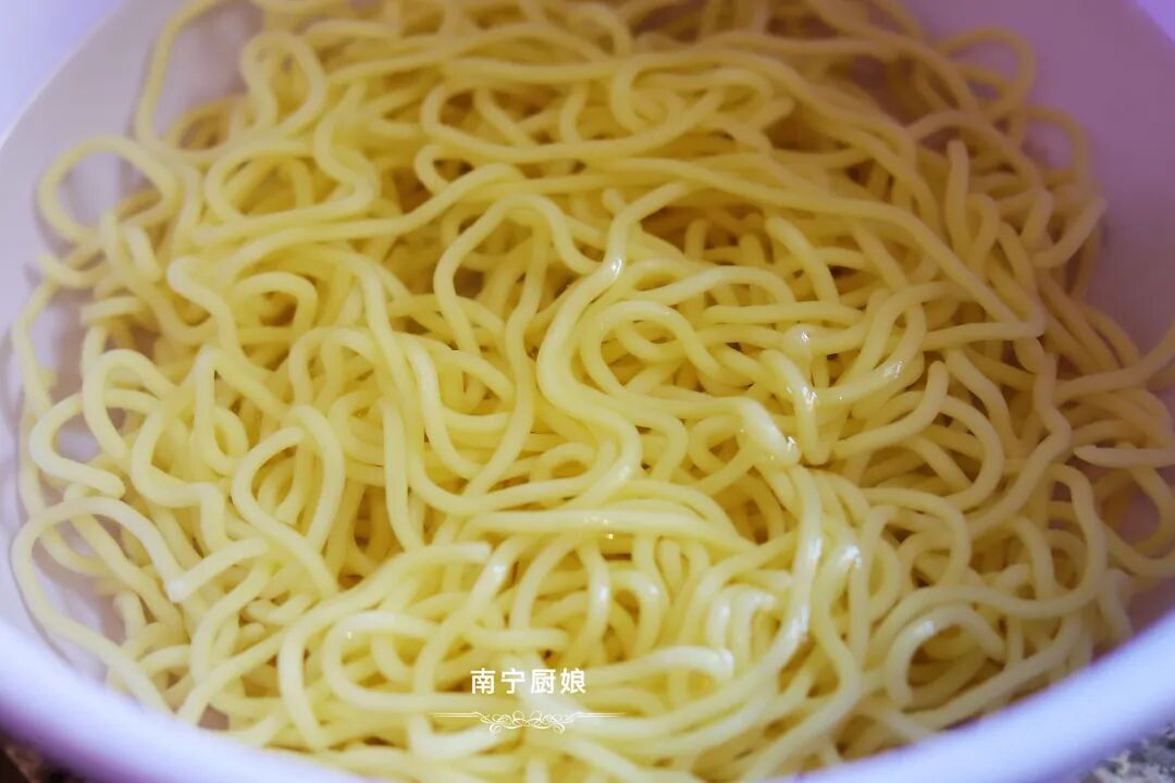 步骤一:将买回来的鲜面条放到开水里煮6分钟,在煮的过程之中用筷子搅动面条,防止面条粘连,煮熟之后的面条捞出来放进装有冷水的盆子里,水量一定要没过面条,这样面条吃起来更加劲道。(很多人炒面时候都是直接下锅炒,其实这样是不对的,应该先煮至七八成熟,然后再放入凉水中浸泡后再沥干水分下锅炒,这样炒面不仅容易熟,也更容易入味,口感Q弹)