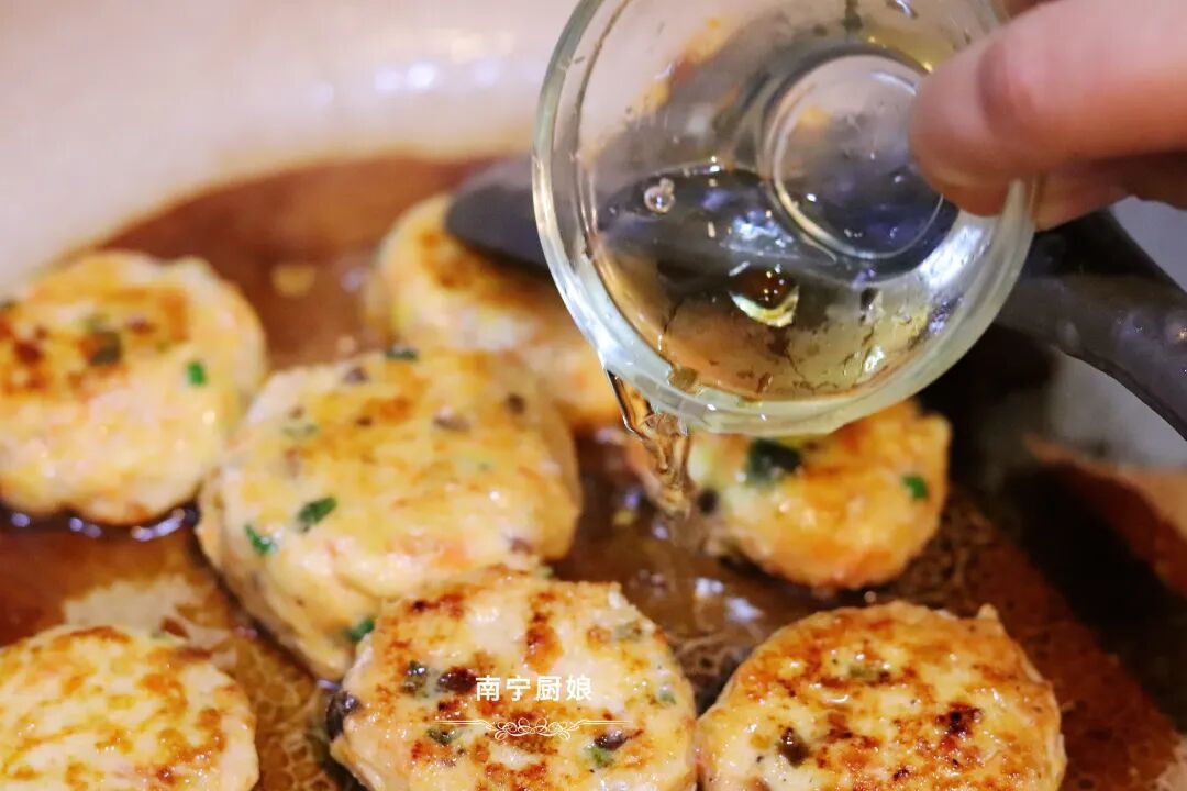 8、当锅里的汤汁基本已经没有水分时,香菇鸡肉饼就可以出锅了。