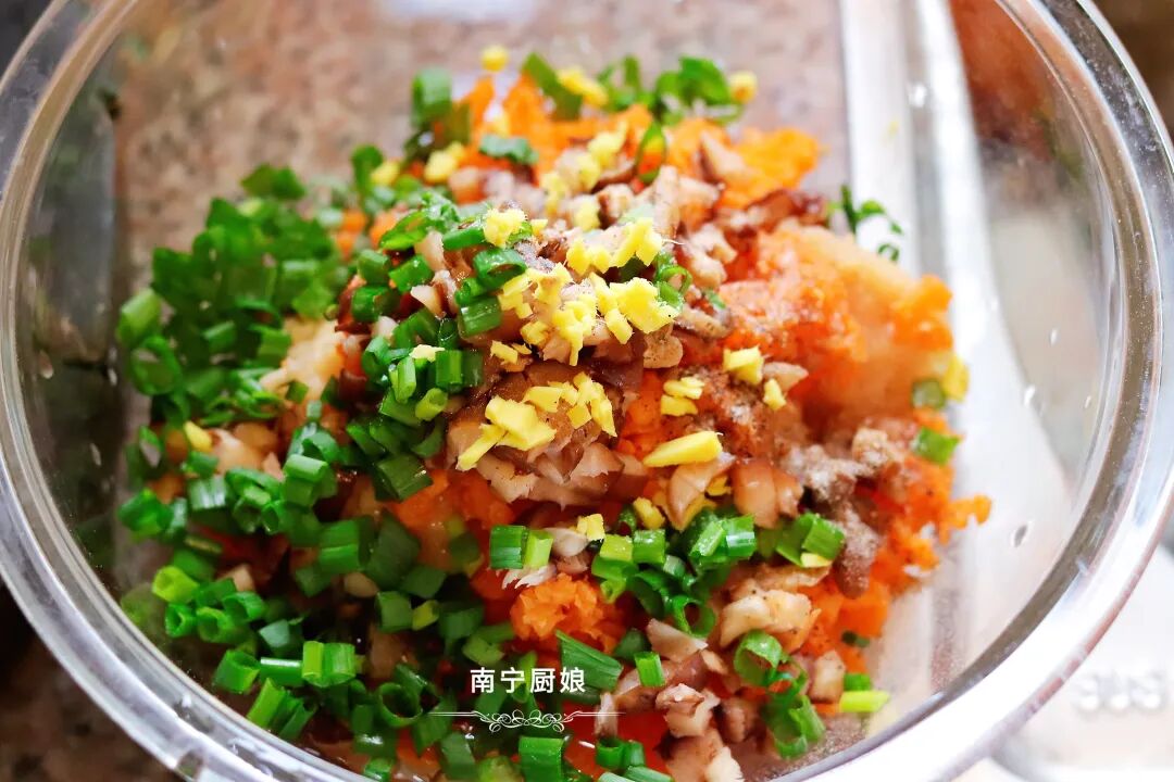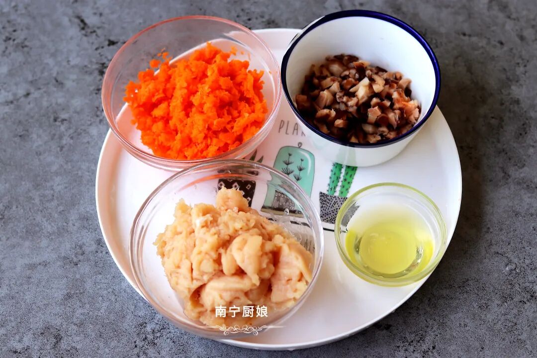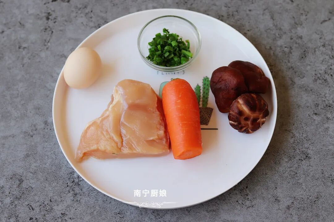 【食材】250克鸡肉、3朵香菇、100克胡萝卜、1个鸡蛋、2根香葱、2片姜