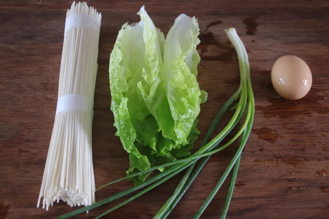 准备好食材:挂面1把、生菜2片、香葱1颗、鸡蛋1颗。