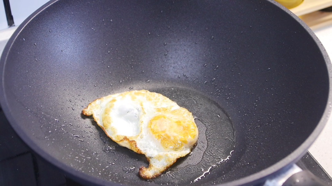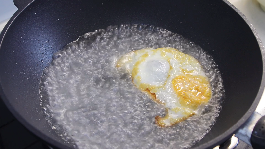 3、鸡蛋煎好后,不用铲出来,往锅中倒入一碗面汤分量的清水,调大火烧开锅中水。