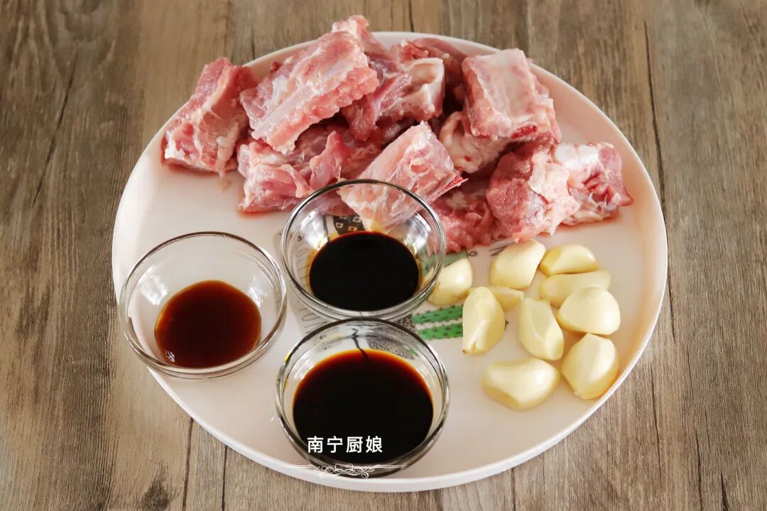 准备好食材:猪排骨1根、大蒜10颗、生抽2勺、老抽半勺、蚝油1勺、白糖小半勺、食盐小半勺。