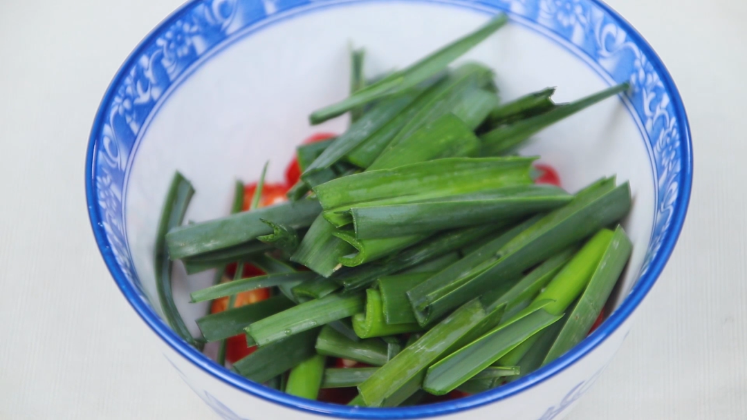 第二步:一小把蒜叶,切成长段,准备适量的小米辣,切成辣椒圈,和蒜叶一起放碗里备用。
