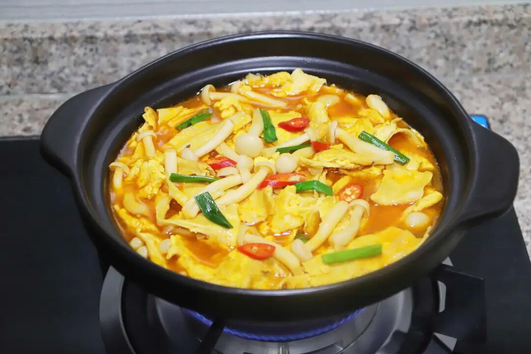 这样一道鲜香味美的鸡蛋腐竹蘑菇锅就做好了,吃起来特别鲜美,汤汁浓郁,很适合搭配大米饭,还可以用来拌面,特别的开胃,一次吃两大碗米饭都不在话下的,而且制作方法也很简单,白玉菇的口感鲜脆,腐竹吸饱了汤汁也特别的入味,喜欢这道鸡蛋腐竹蘑菇锅的小伙伴赶紧转发或者收藏起来。