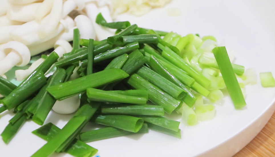第二步,准备一些配菜,白玉菇洗净之后,切掉根部,放一旁备用。蒜米拍碎,再剁成蒜末,小米辣切成圈,和蒜米一起放在碟子里备用。小葱切成段,葱白和青葱的部分分开切好,放在碟子里备用。