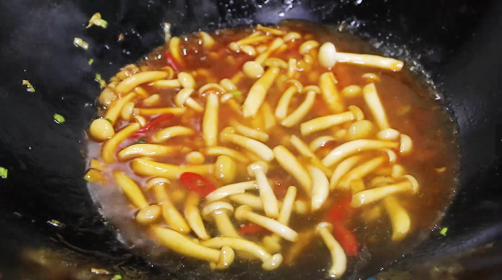 第五步,锅里重新下油,加入蒜末小米辣以及葱白,翻炒出香味,再加入白玉菇,一起翻炒出香味,这个时候再往锅里倒入适量的番茄酱、蚝油、生抽、白砂糖以及少量的食盐,再倒入半碗的清水,搅拌均匀,把锅内的汤汁煮开。